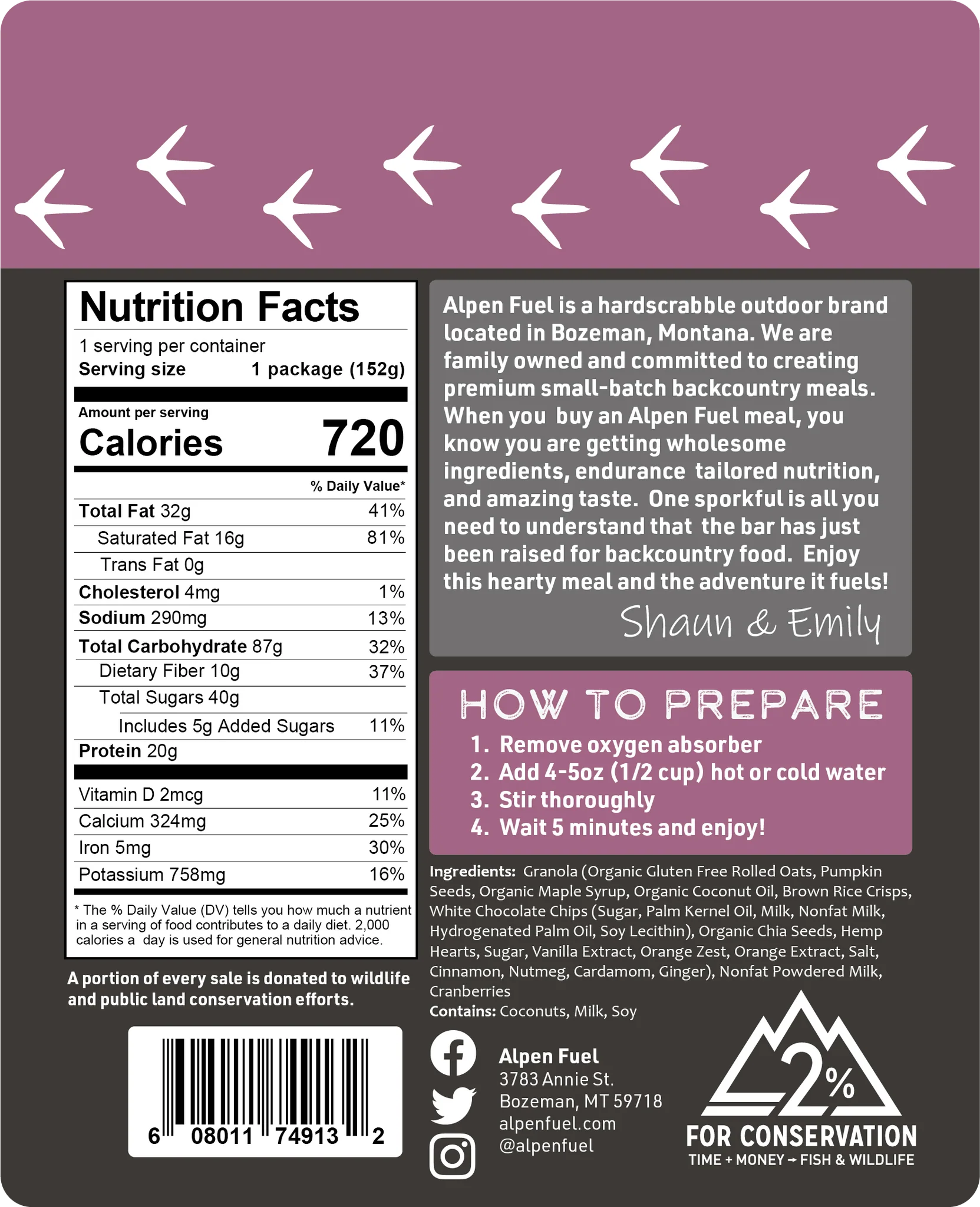 Alpen Fuel's legendary long-lasting energy is now nut free! Made with sprouted pumpkin seeds, hemp hearts, and chia seeds, this breakfast meal packs a serious punch that will keep you energized for hours. Added cranberries and white chocolate chips make this a meal you won't soon forget.