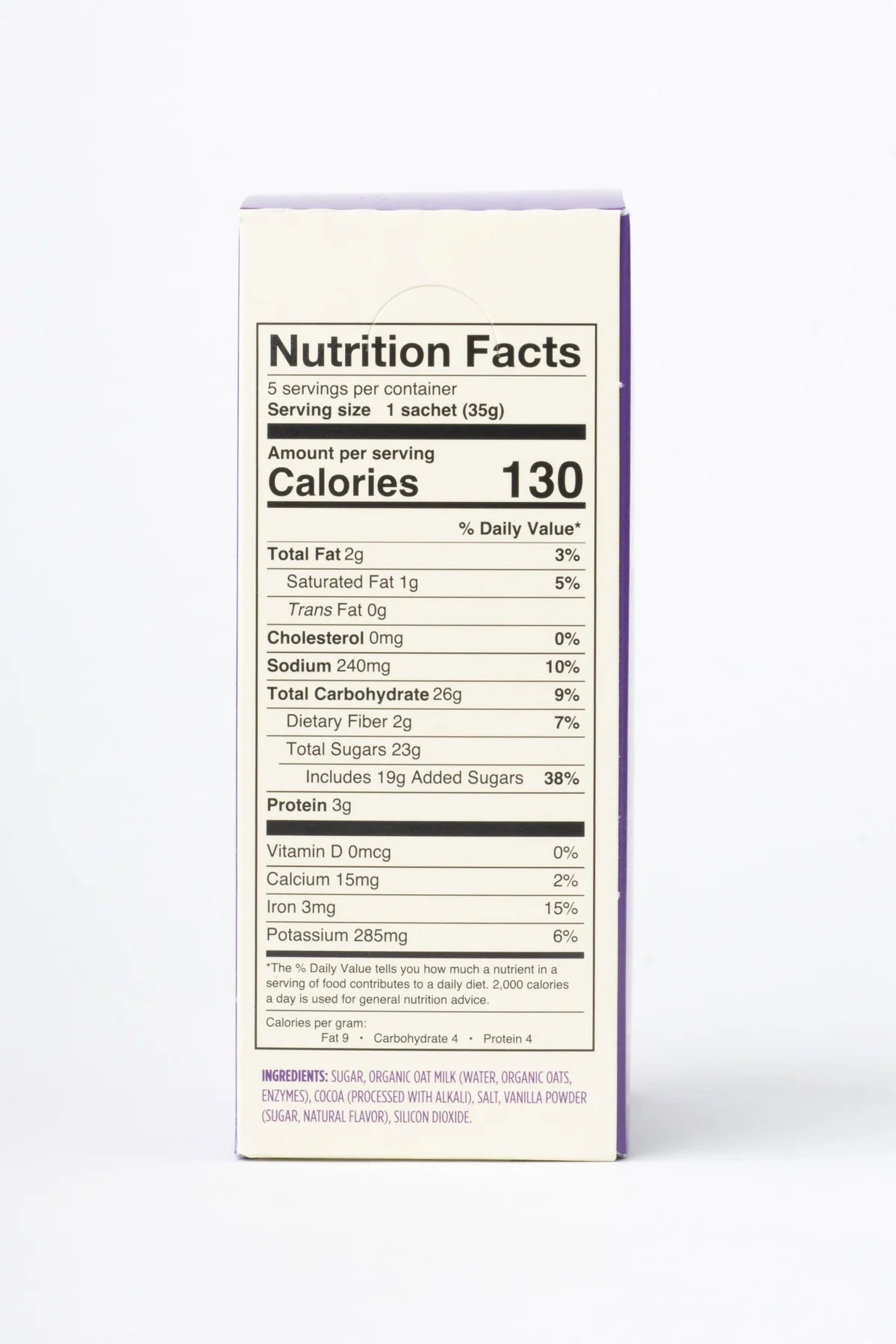 Indulge in the rich, creamy comfort of our new hot cocoa! Crafted with smooth, organic oat milk for a dairy-free twist on a classic favorite - all while keeping it as good or better than a milk based drink! Each convenient pack contains 5 individually wrapped servings, making it perfect for cozy moments at home or on-the-go sipping. Our premium blend delivers the perfect balance of chocolatey decadence and wholesome goodness.