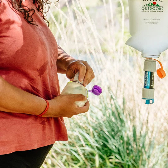 Using the same universal 28mm thread as the Vecto, the Vesica can be used as a dirty water bottle for filters like Sawyer or HydroBlu. If you like to filter into a container for easy drinking, use the Vesica with the Vecto to create a fast, light and easy to use filtering system.