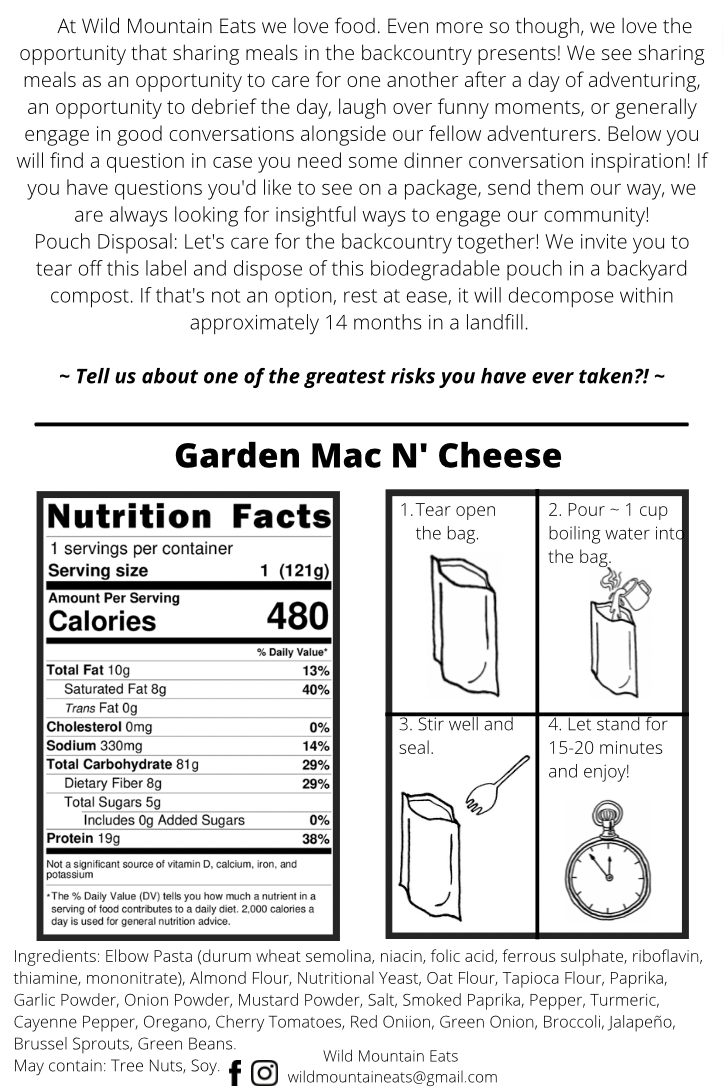 Many enjoy this meal as it is on backcountry trips, but there is plenty you can do to change it up a bit! Adding a spicy sausage or some tofu would be a great way to increase the protein and overall calories. If you happen to have some extra cheese sitting around, that would also be a delicious addition! If there are other ways you enjoy this meal, we’d love to hear, or better yet, tag us in your pictures telling us your favourite way to eat our Garden Mac N’ Cheese!