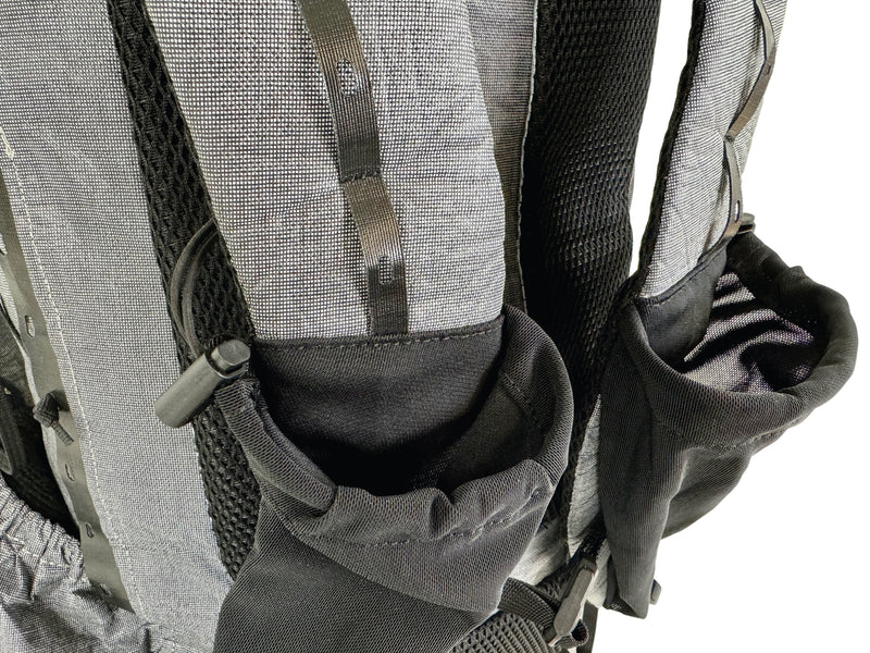 That includes shoulder straps with an S-shape similar to our larger Kakwa packs. This shape has been very well received and fits almost everyone better than straighter straps. The shoulder straps also have a differential cut to naturally curve over your shoulders, and feature laser cut daisy chains that provide a wide range of up/down adjustment for the sternum strap.