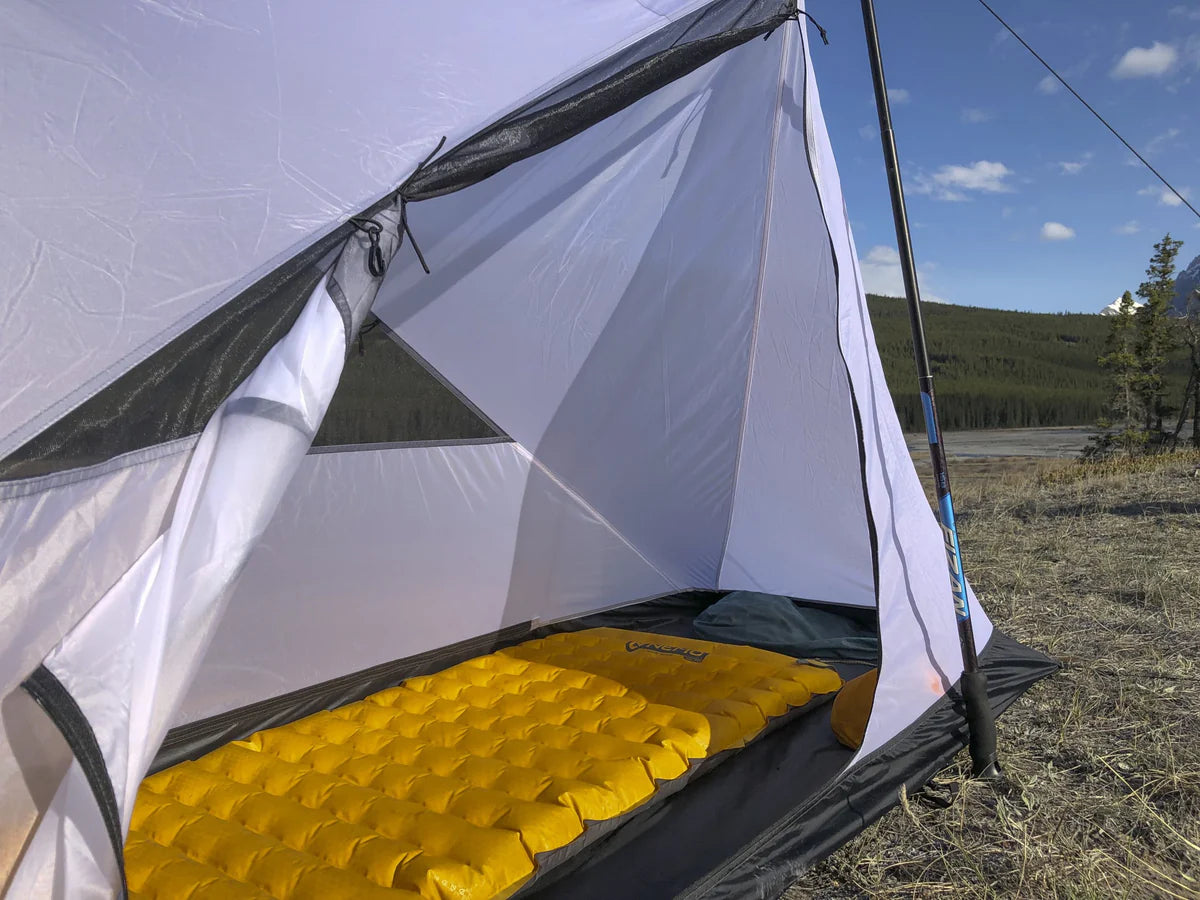 The diagonal (offset pole) ridgeline increases headroom and interior volume over other dual pole shelters.