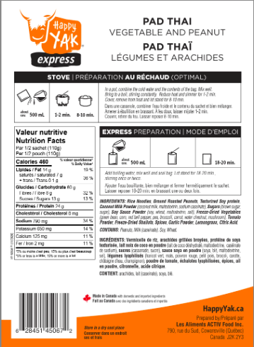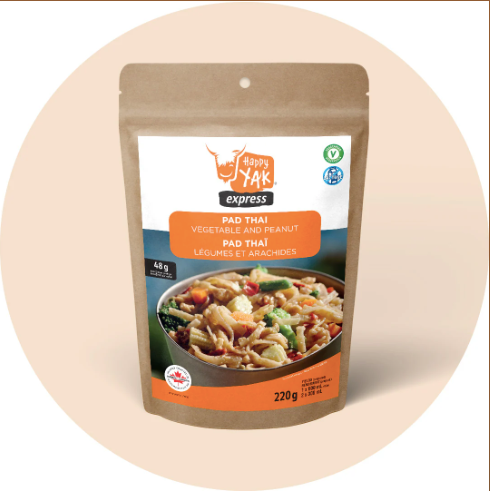 Looking for a restaurant quality Pad Thaï on the go? Happy Yak has formulated a delicious express Pad Thaï that is vegetarian, lactose-free that is less than 1% gluten. This large portion will impress you with its 48 g protein and 920 calories. That explains why, Happy Yak's Pad Thaï is the number 1 choice of many of our clients.