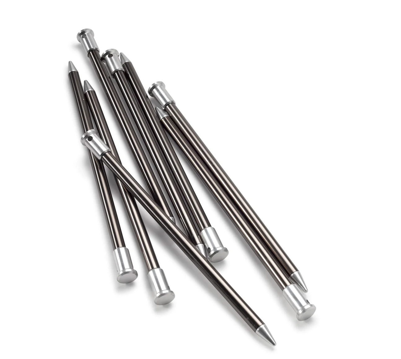 Whether you have to or not, these aluminum stakes are worth back-tracking to the last camp for retrieval if you forget them. Super light and built to provide unfaltering reliability with an extremely high strength to weight ratio. Eight inches long and shaped for a tenacious bite in a variety of surfaces. Set of eight.