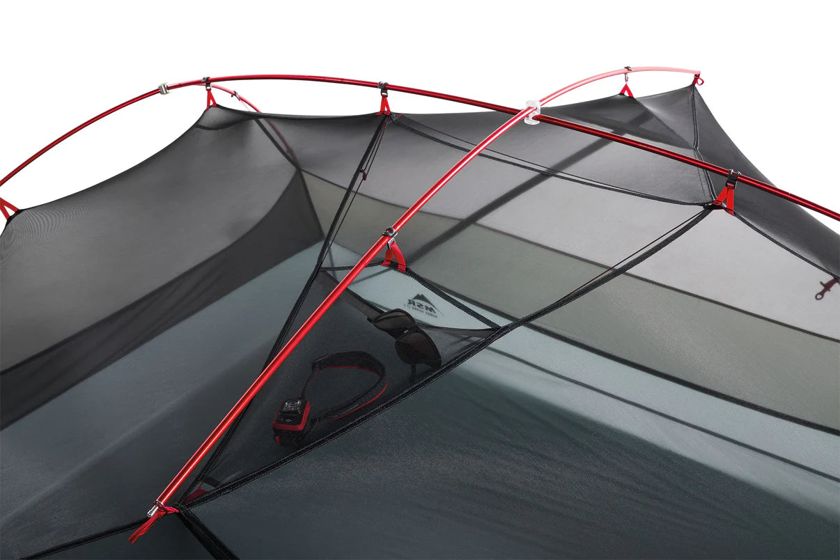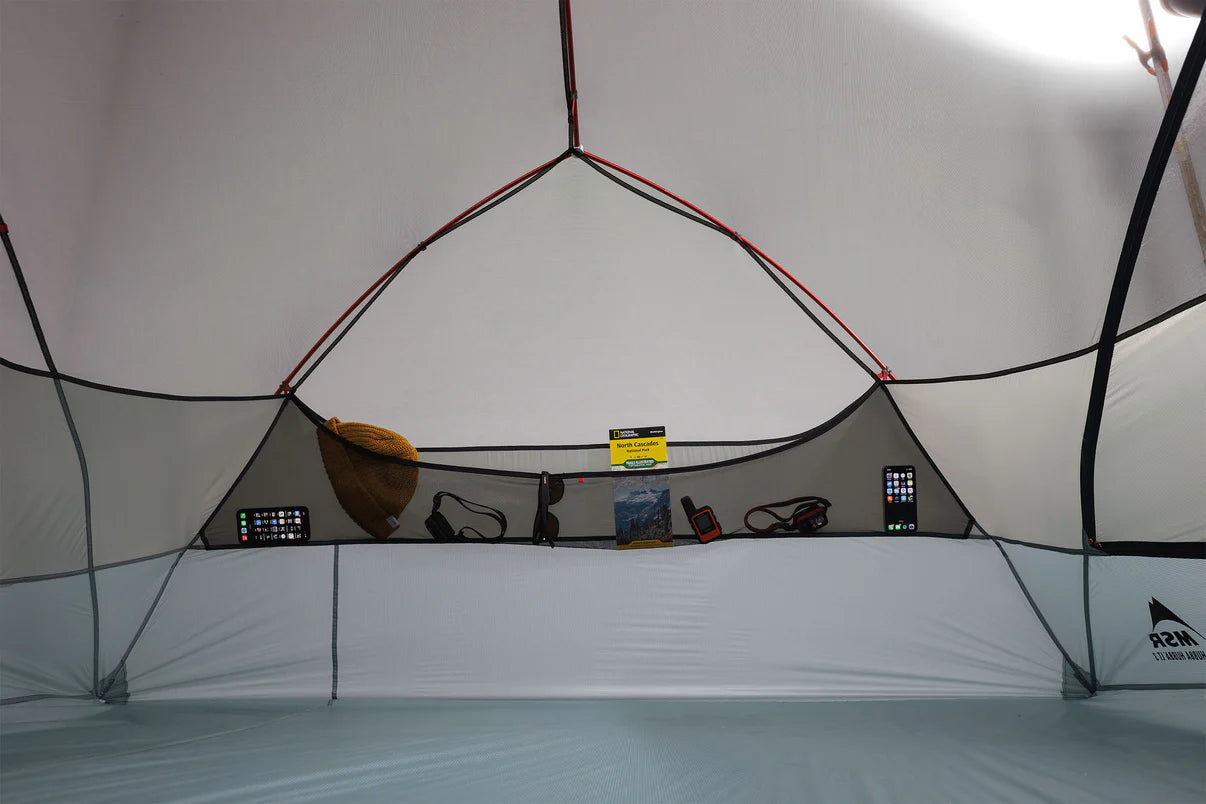 The Inside: The interior is a grand 47 sq. feet with no taper to accommodate modern rectangular sleeping pads. The tent body is mostly solution-dyed micromesh for exceptional breathability and bug protection, perfect for star-gazing on clear nights. No-curve tent doors feature zippers that are easy to use with one hand. They also zip closed to a single point so you always know where to open the door, even in the dark. Tech-friendly pockets feature cable ports at the corners for headphones and charging cords. Large overhead gear loft pockets are perfect for headlamps, sunglasses and other quick-access items, and an included clothesline lets you dry out damp clothes.