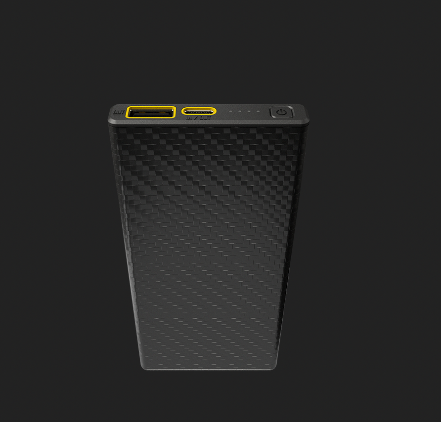 The Carbo 10000 has a USB-A and a USB-C port. The USB-C QC port is an in-and-out port for both recharging the power bank and a lightning fast 20W QC charging of electronics. The USB-A port is capable of a 18W QC output, and can run at the same time as the USB-C port. For delicate devices such as bluetooth headphones and smart watches, the Carbo 10000 has a one-touch low current mode.