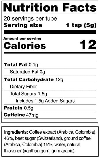 Ingredients: Coffee extract (Arabica, Colombia) 46%, beet sugar (Switzerland), ground coffee (Arabica, Colombia) 15%, water, natural thickener (xanthan gum, gum arabic)