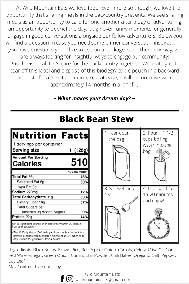 Many enjoy this meal as it is on backcountry trips, but there is plenty you can do to change it up a bit! One of our favourite ways to eat this meal is burrito style. This involves adding slightly less water than the instructions state. Once the stew is rehydrated, but very thick, put it in a wrap, with some fresh avocados, and you've got a delicious backcountry burrito! Have some extra cheese? Throw that on too! This is also a great way to make this meal go a bit further as with the addition of the wrap and avocado, you can split one bag between two. If there are other ways you enjoy this meal, we’d love to hear, or better yet, tag us in your pictures telling us your favourite way to eat our Black Bean Stew!