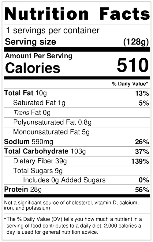 Ingredients: Black Beans, Brown Rice, Bell Pepper Onion, Carrots, Celery, Olive Oil, Garlic, Red Wine Vinegar, Green Onion, Cumin, Chili Powder, Chili Flakes, Oregano, Salt, Pepper, Bay Leaf.