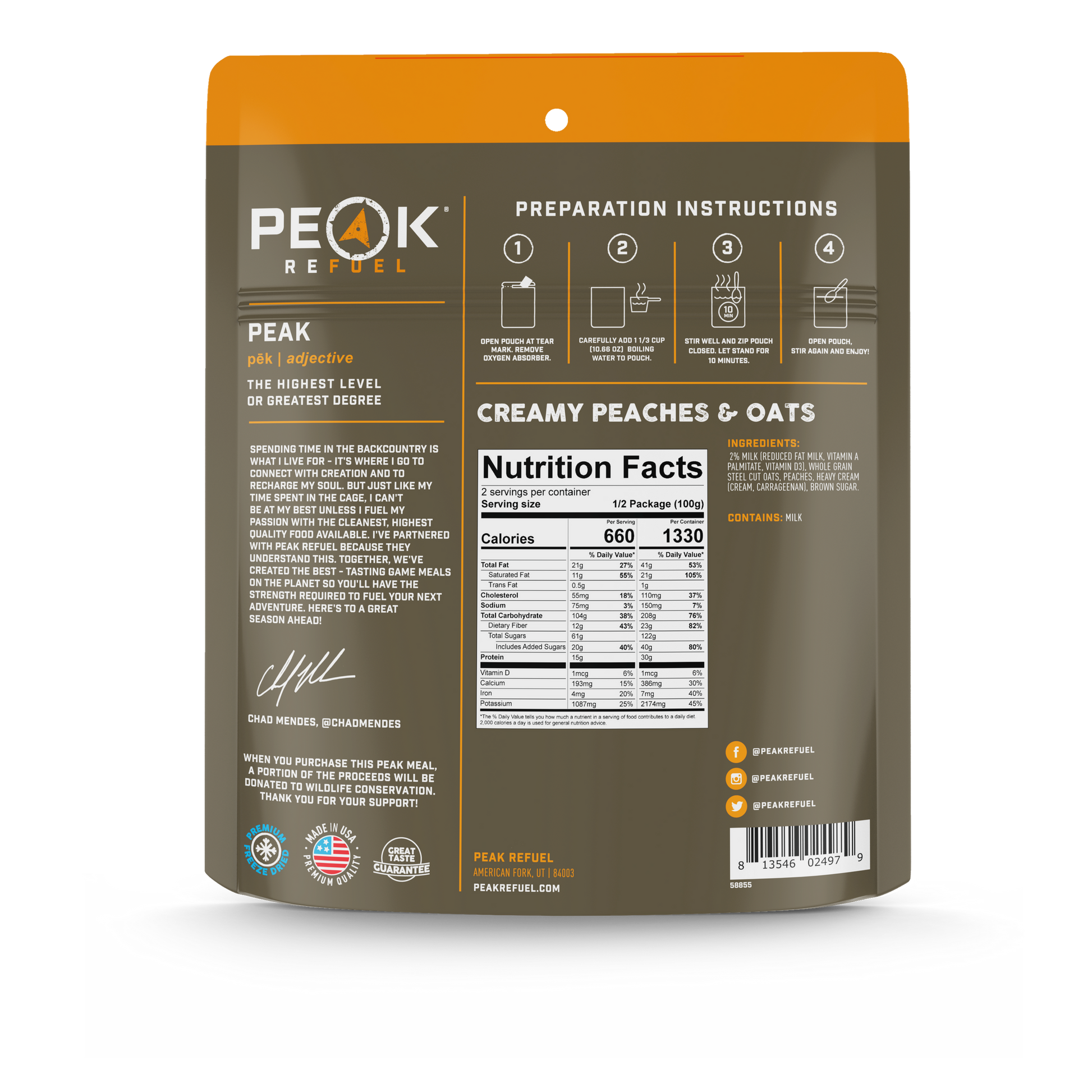 "I wanted to create a meal that embodied the taste of a home-cooked meal while still providing the best fuel out there. With the perfect amount of steel cut oats, delicious peaches topped with cream and brown sugar, you'll feel like you're sitting at the breakfast table even in the deepest part of the backcountry. This will definitely leave you wanting more - I'm pumped for you to try it!"
