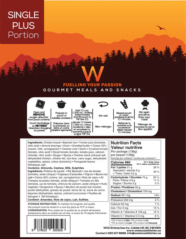 Ingredients: chicken breast, basmati rice, almond shavings, unsalted butter (colour), cream 33% fat, cashew nuts, garlic, onion, crushed tomato, diced tomato, whole tomato, vegetable oil, ginger, fresh coriander, ground cumin, cinnamon, paprika, cardamom, cloves, chili powder, garam masala (sulphites), bay leaves, black pepper, turmeric, nutmeg, fenugreek leaves, Himalayan salt.