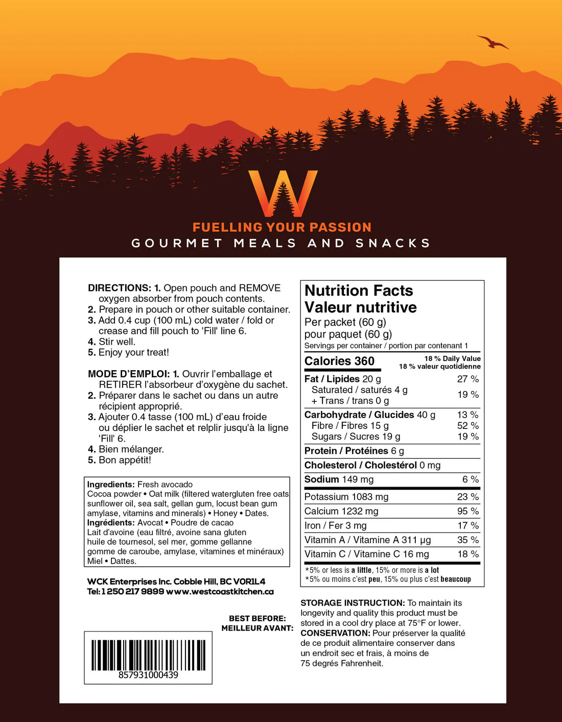 Healthy treat for the trail with avocado, oat milk, cocoa, date, and honey.