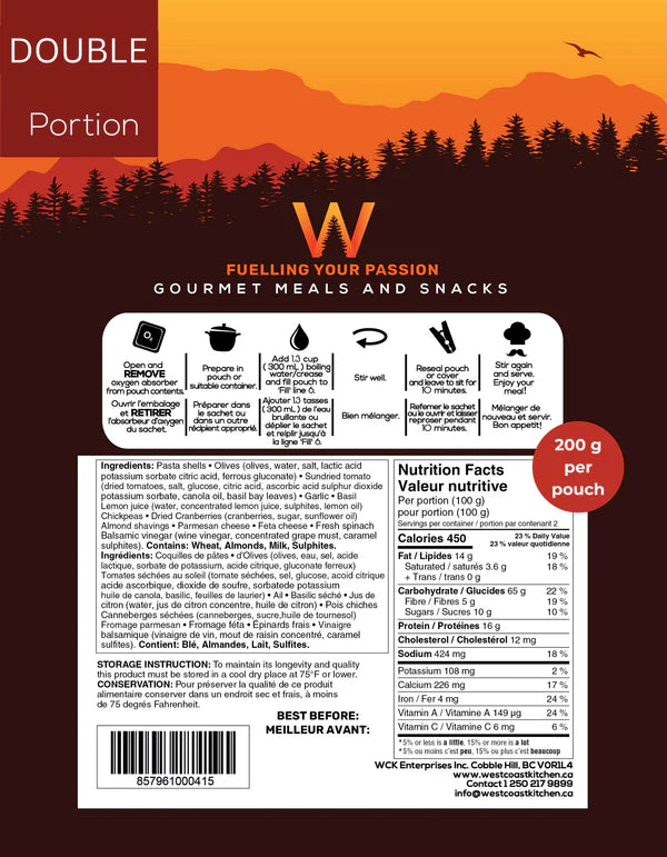 Delicious and filling pasta dish made with Fat Chili Farm’s homemade olive pesto, with chickpeas, fresh spinach, cranberries, feta and parmesan cheese.