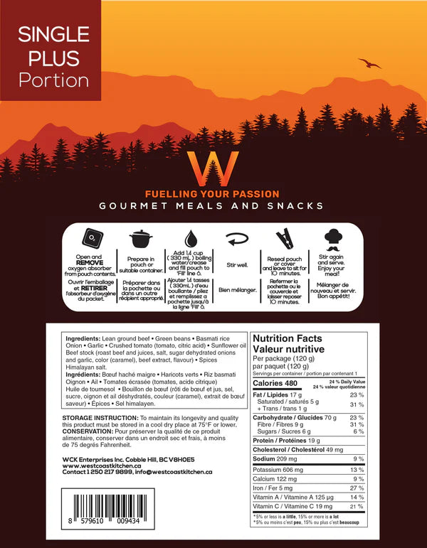 Ingredients: Lean ground beef, green beans, basmati rice, onion, garlic, tomato paste (gluten free), sunflower oil, Himalayan salt, vegetable stock (gluten free), paprika, cinnamon, black pepper, turmeric