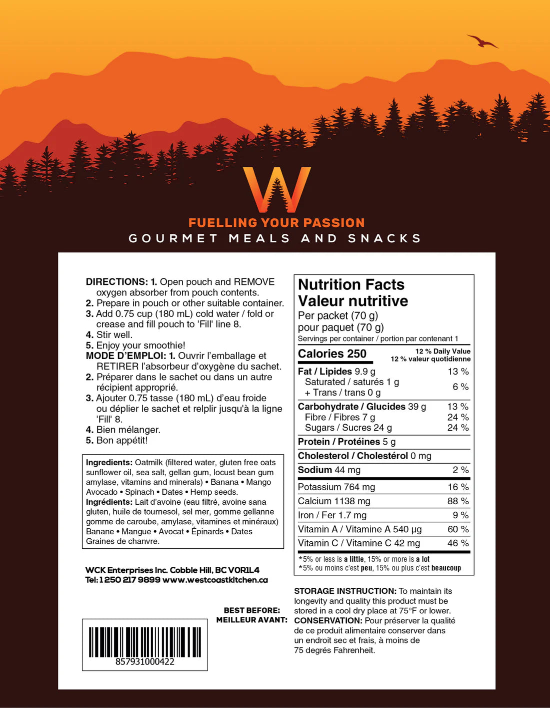 Ingredients: Oat milk, banana, mango, avocado, spinach, dates, hemp seeds.