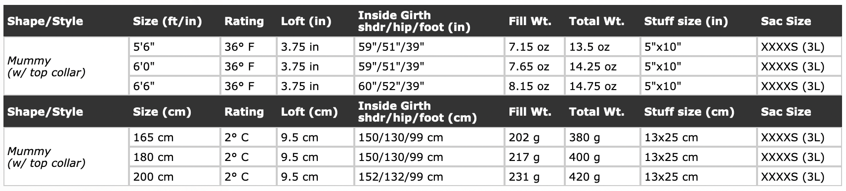 Introducing the FlyLite down sleeping bag.  It was designed as a product to celebrate Western Mountaineering's 50 year commitment to manufacture the lightest, most compressible sleeping bags in the world. They feel that this sleeping bag is a product to show the global lightweight gear community (triple crown thru hikers,  trail runners, bike packers, and friends with cool names like “Psycho Haiko”)  that they have been listening and taking your feedback into consideration. Their effort has resulted in the worlds lightest weight down sleeping bag that is fully baffled (i.e. no quilted/sewn through construction). The tiny micro baffles create just enough separation between the lining material and the outer shell fabric to eliminate cold spots. 10 denier fabric lining and 10 denier nylon taffeta shell fabric with C-zero DWR with the finest polish 850+ goose down and a super light #3 YKK half zipper all contribute to the impressive specifications and performance. This bag weighs just over 14 ounces ounces/400 grams in the regular length and packs down to the size of a Nalgene bottle. Lower limit rating of 36 F/ 2C.