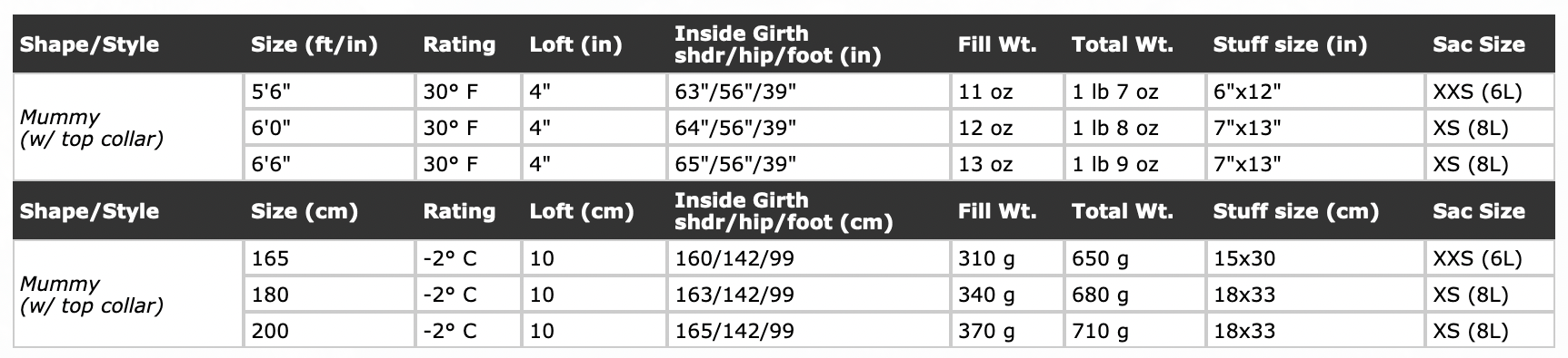 The MegaLite is cut to suit large folks so they too can enjoy the benefits of the ExtremeLite™ bags. No claustrophobia here with 64″ of shoulder girth tapering to 39″ at the foot. 12 ounces of goose down provides a temperature rating of 30°, and continuous baffles allow you to adjust the fill to suit your needs. At only 1 lb. 8 oz. this is your best friend during a summer bike trip.