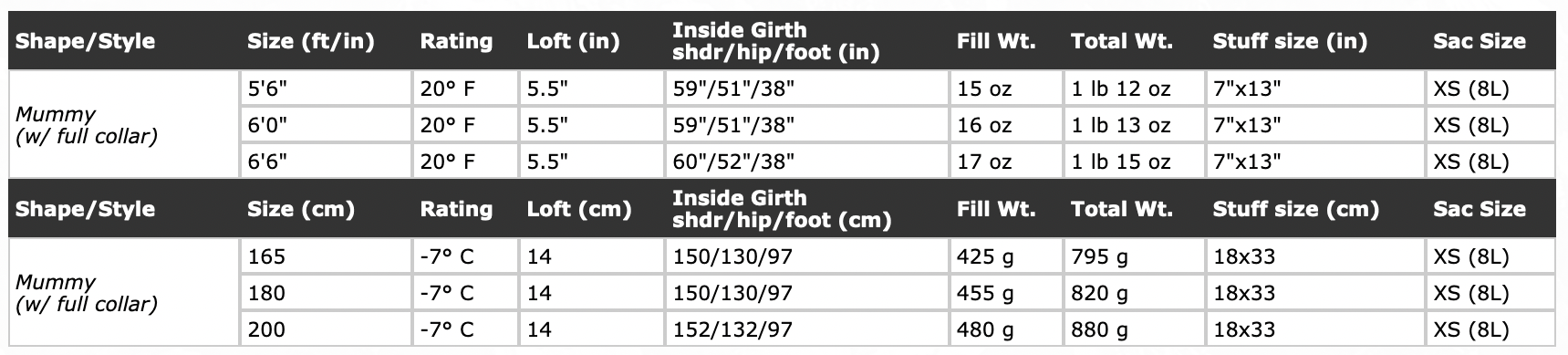 If your summer bike tour is going to take you through different climates then the UltraLite is a good choice. With a 59″ shoulder girth this efficient bag is good to 20°. The full down collar helps to seal in heat around your neck without adding excess bulk, and 16 oz. of high lofting down pumps this bag to 5″. The total weight of this very compressible package is only 1 lb. 13 oz.