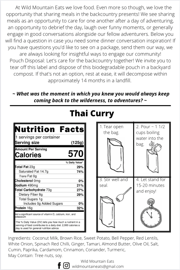 Many enjoy this meal as it is on backcountry trips, but there is plenty you can do to change it up a bit! Adding a thai flavoured sausage would be a great way to increase the protein and overall calories. If you are a bit of a smaller eater, you could potentially split a bag with a friend, adding a naan bread to make the meal go further. If there are other ways you enjoy this meal, we’d love to hear, or better yet, tag us in your pictures telling us your favourite way to eat our Thai Curry!