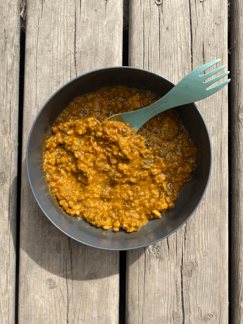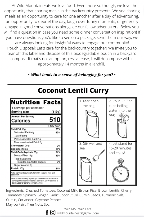 Many enjoy this meal as it is on backcountry trips, but there is plenty you can do to change it up a bit! A piece of naan bread would be a great addition this meal while also adding some calories. A dollop of plain yogurt would also be a yummy addition! If there are other ways you enjoy this meal, we’d love to hear, or better yet, tag us in your pictures telling us your favourite way to eat our Coconut Lentil Curry!