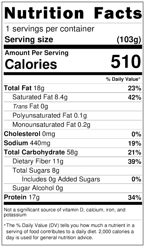 Ingredients: Crushed Tomatoes, Coconut Milk, Brown Rice, Brown Lentils, Cherry Tomatoes, Spinach, Ginger, Garlic Coconut Oil, Cumin Seeds, Turmeric, Salt, Cumin, Coriander, Cayenne Pepper.