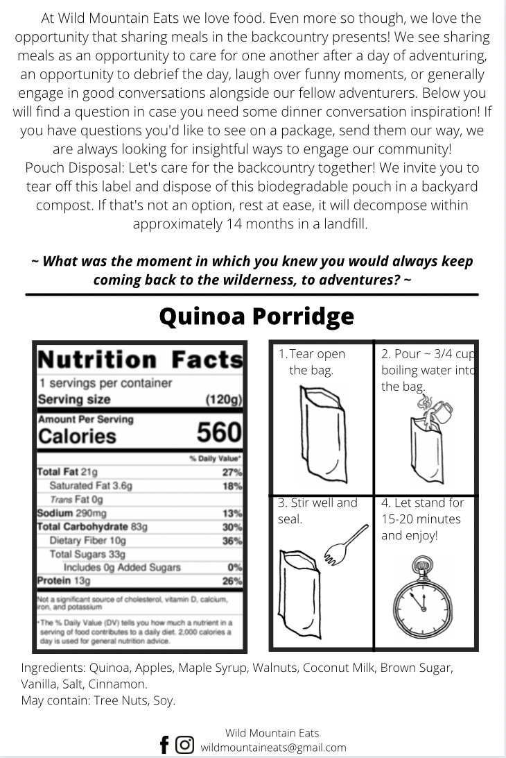 Many enjoy this meal as it is on backcountry trips, but there is plenty you can do to change it up a bit! Adding some of your favourites nuts or seeds would be great additions! Or some of those leftover raisins at the bottom of your trail mix! If there are other ways you enjoy this meal, we’d love to hear, or better yet, tag us in your pictures telling us your favourite way to eat our Quinoa Porridge!